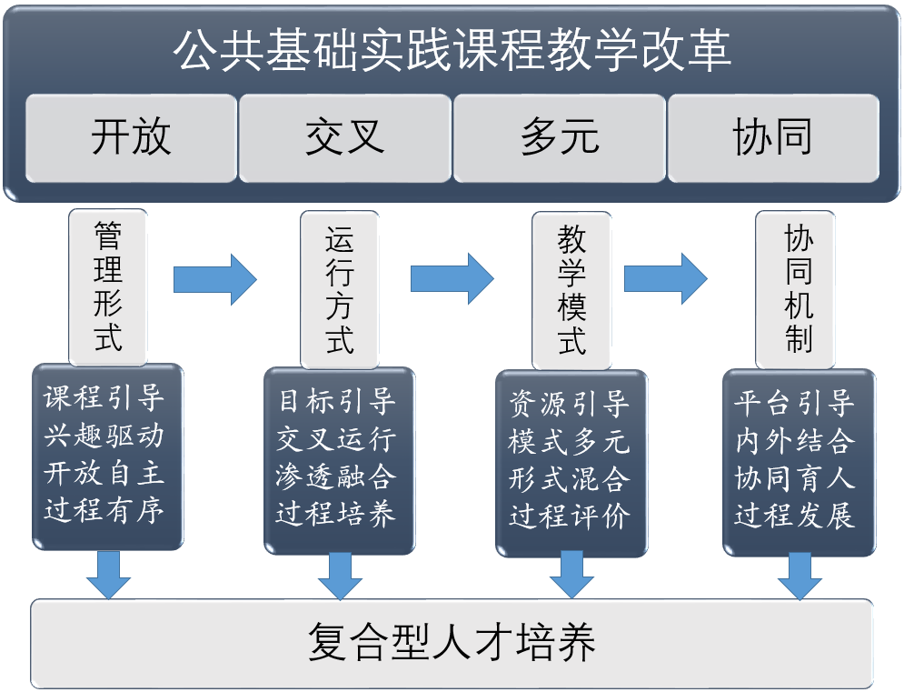 目前,物理实验中心分布于将军路校区和天目湖校区,实验室建筑面积近8000平方米,资产总额约3000余万元。各实验室面向全校各专业学生教授物理实验课程20多门,开设实验项目数量100多项,年开放人次数近6万。中心现有教师17人,其中高级职称5人,中级职称12人。在互联网+、新工科建设引领的新一轮科技革命和产业变革背景下,物理实验中心践行以“开放管理、交叉培养、多元融合、协同育人”为导向的教学理念和育人模式(图2),注重教学管理与信息技术的深度融合,育人模式与形势发展的高度结合,为PA视讯复合型人才培养打下了坚实的基础。
