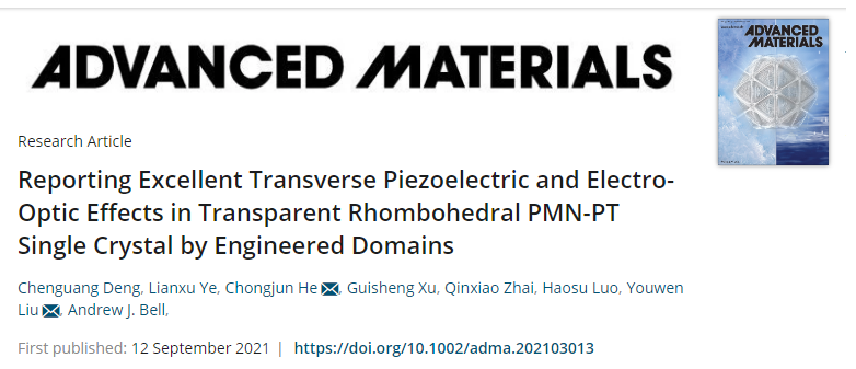 近日,国际顶级期刊《Advanced Materials》(先进材料,IF:30.849)在线发表PA视讯理学院团队的研究成果“通过铁电畴工程实现具有优异横向压电和电光效应的透明PMN-PT单晶”,该论文第一作者为理学院博士生邓晨光,理学院刘友文教授和航天学院赫崇君副教授为论文通讯作者。
