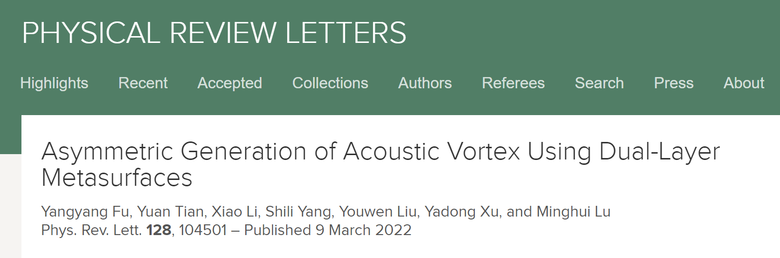 近日,PA视讯应用物理系伏洋洋副研究员和刘友文教授与苏州大学的徐亚东教授、南京大学的卢明辉教授等合作,利用双层超构表面中的单向轨道角动量转化机制,首次提出一种涡旋声场非对称产生的新现象和物理机制。相关成果以 “Asymmetric generation of acoustic vortex using dual-layer metasurfaces”为题发表在物理学权威期刊《Physical Review Letters》上。伏洋洋副研究员为论文的共同通讯作者和第一作者,苏州大学的徐亚东教授和南京大学的卢明辉教授为论文的共同通讯作者。