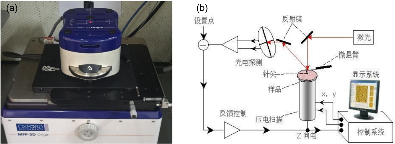 图3.(a)AFM实物图 ; (b)AFM测试原理图