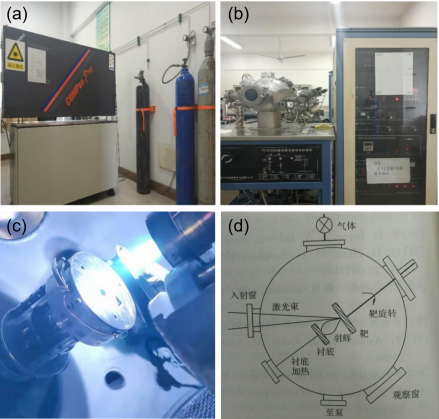 (c)溅射期间激发的羽辉; (d)PLD装置