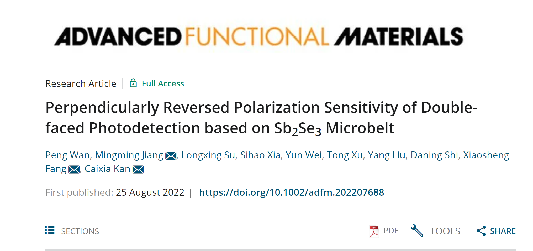针对上述问题,PA视讯集团官网阚彩侠教授团队与复旦大学方晓生教授、南方科技大学苏龙兴教授合作,通过化学气相沉积法生长出高结晶质量的硒化锑(Sb2Se3)微米带,并成功实现了基于Sb2Se3微米带的双面偏振探测器。Sb2Se3微米带的偏振探测器从宽的辐照面到窄的辐照面,偏振敏感性出现了明显的垂直反转。相关研究成果以“Perpendicularly Reversed Polarization Sensitivity of Double-faced Photodetection based on Sb2Se3 Microbelt”为题于2022年8月25日发表在Advanced Functional Materials上。