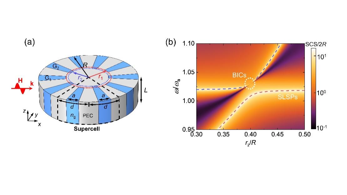 图1. 纹理化金属圆柱中的等离激元BIC 。(a) 结构示意图。(b)二维金属结构散射截面的解析结果。