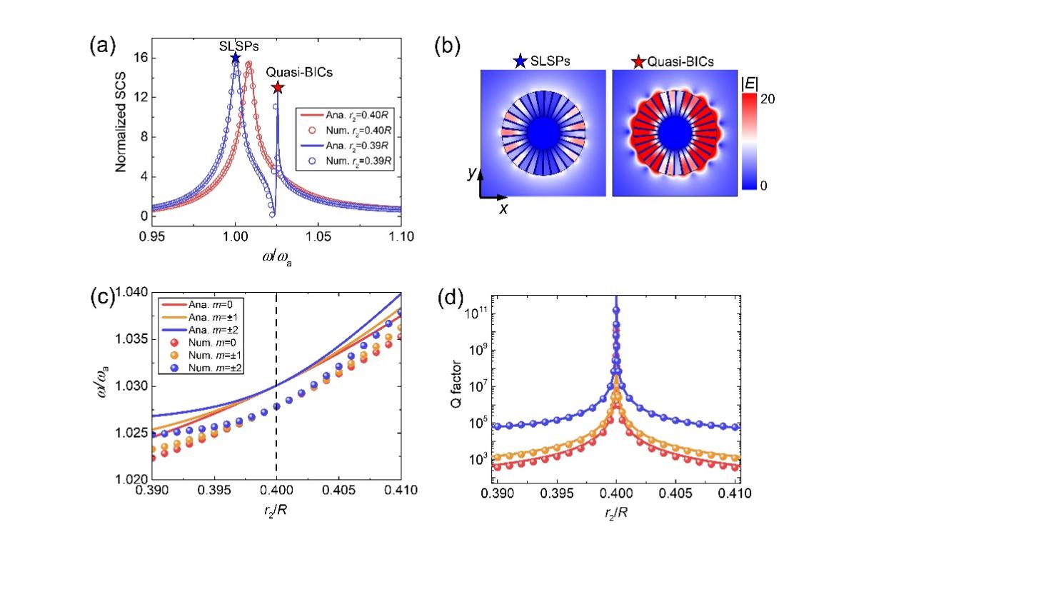 图2. 多极BIC简并。(a) 散射截面。(b) SLSP和准BIC的场增强效果。(c)多个OAM通道的BIC且在r2=0.4R处完全简并。(d)为c中Q因子。