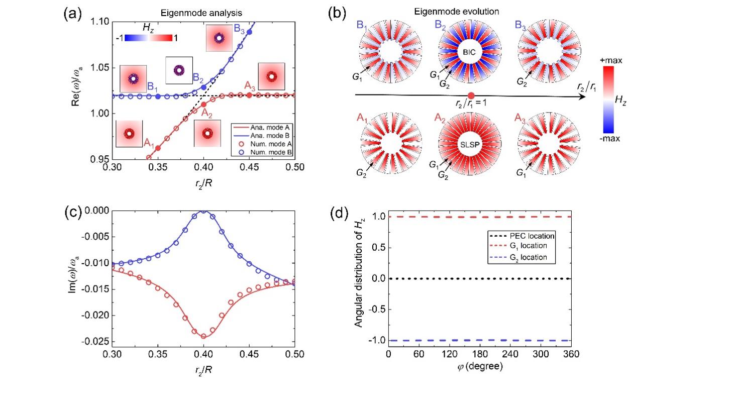 图3. BIC产生的物理机制。(a) 在m = 0通道中的两个SLSP模式耦合。(b)金属结构中的本征模式演变。