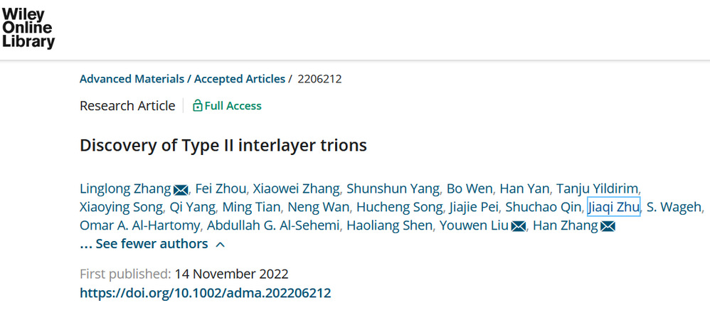近日,国际顶级期刊《Advanced Materials》(先进材料,IF:32.09)在线发表PA视讯PA视讯集团官网团队的研究成果“发现II类层间三激子”。南航为第一通讯单位。