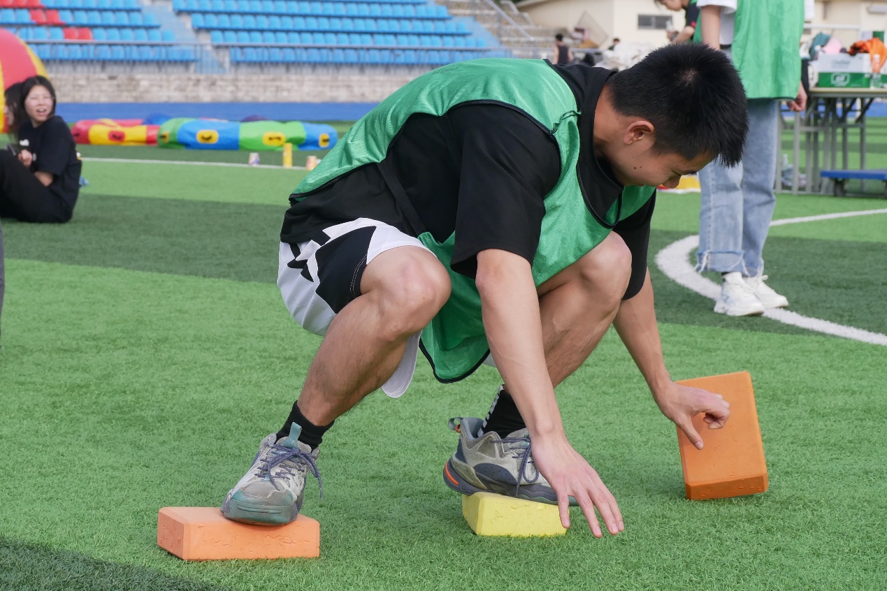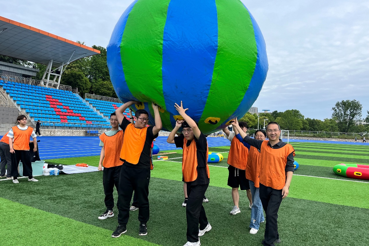 在“厚德载物 运转乾坤”项目中,四支代表队的选手们各自8名队员分工合作,努力配合,在听到哨声的一刹,合理扛着“乾坤球”在跑道上冲刺接力。在烈日照耀下,大家不畏艰辛,都在努力为团队争夺分数,越过终点线时的喜悦洋溢于脸上。