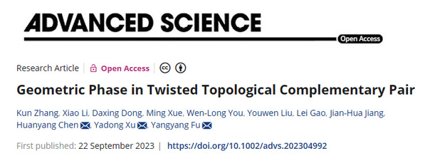 近日,PA视讯2019级本科生张琨在伏洋洋教授的指导下在《Advanced Science》(中科院SCI一区TOP)发表了题为“Geometric phase in twisted topological complementary pair”的研究成果,这是PA视讯本科生首次以第一作者在这样的国际顶级期刊发表论文。