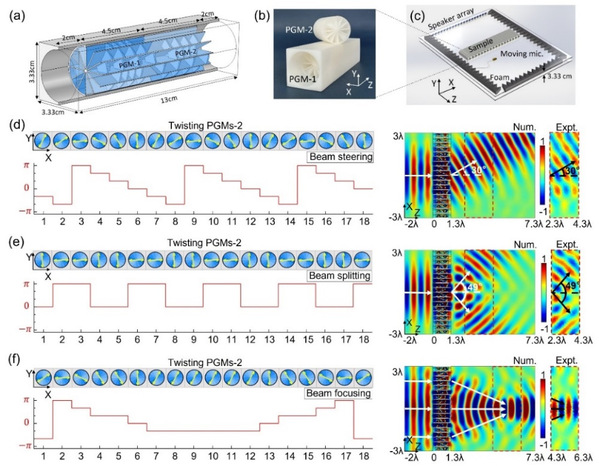 作为概念性验证,该工作在标量声波体系中证明了这种几何相位的存在,并展示了其在亚波长尺度下精确操控声场的能力。该工作利用卷曲空间的超材料结构设计了声学TCP,并用以构建声学几何相位超表面(18个TCP组成的阵列结构),通过对每个TCP扭转不同的角度来任意调制超表面中的几何相位,从而实现对亚波长声场精准高效、可重构调控(比如,波束高效转向、分离、聚焦等现象,见图2)。这些结果为人工微结构中的波与物质相互作用提供了全新的认识,并建立了一个探索几何相位的新平台,为经典波动系统中多样化的应用提供了重要机遇。