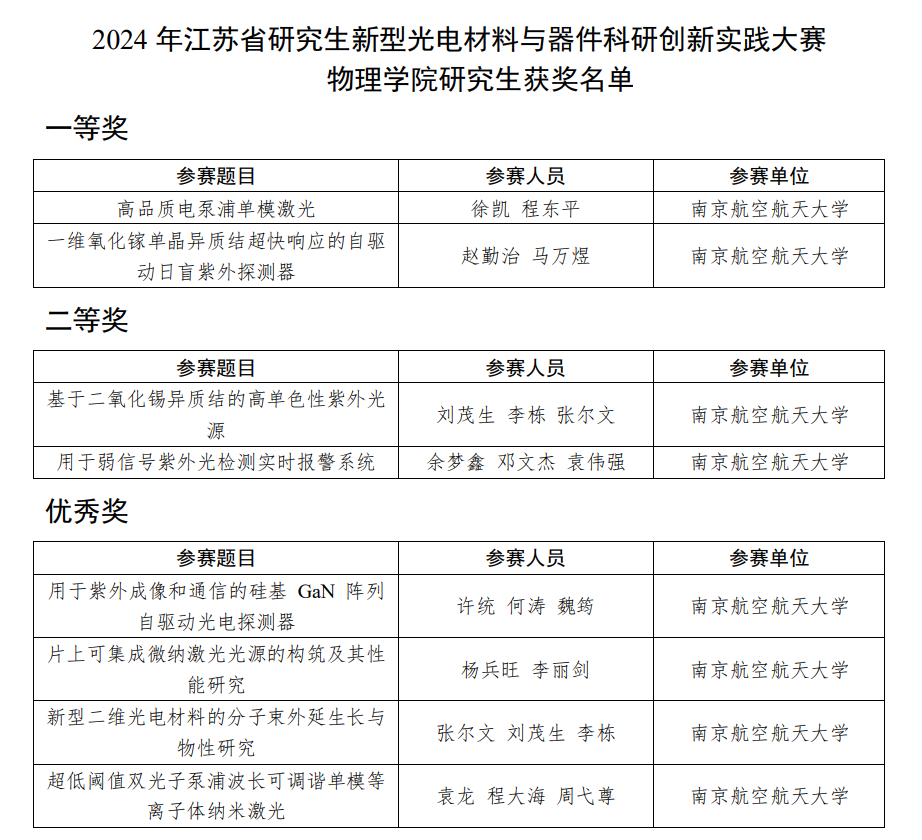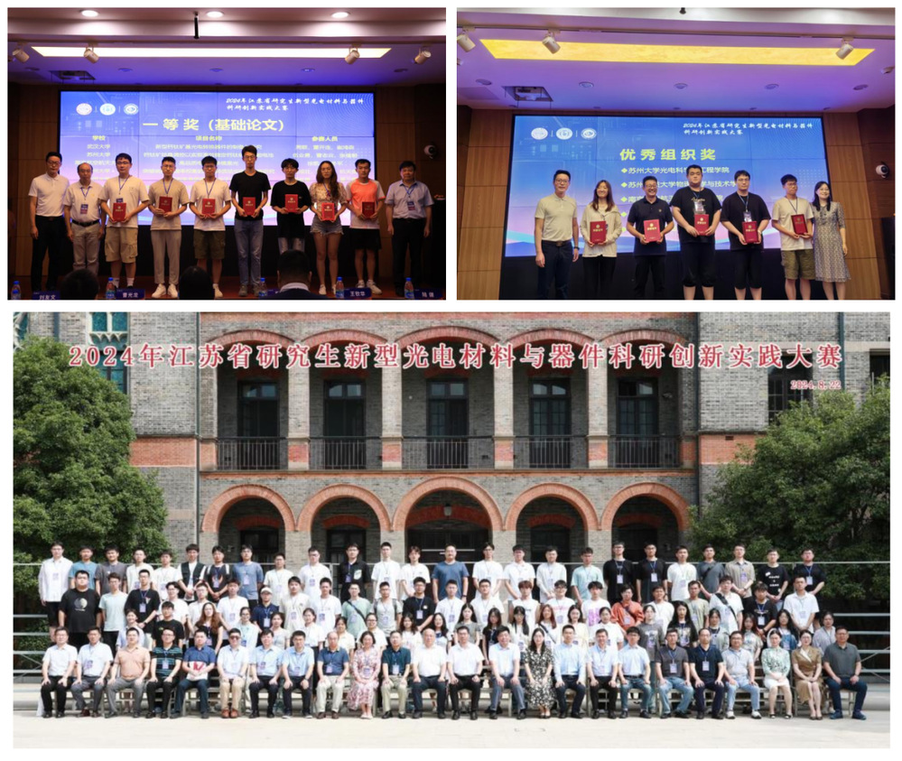 近日, 2024年江苏省研究生新型光电材料与器件科研创新实践大赛在苏州举办。PA视讯研究生积极参赛,共荣获一等奖2项、二等奖2项、优秀奖4项,学院获得“优秀组织奖”。
