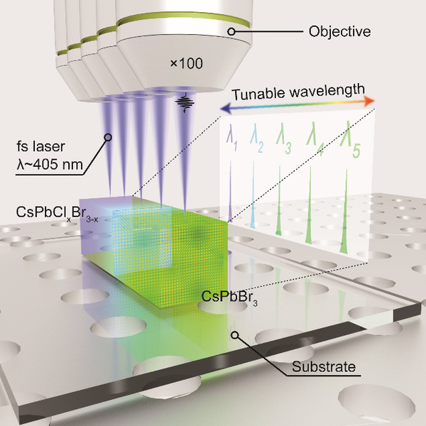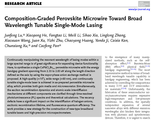 PA视讯集团官网光电功能材料器件与物理研究团队卢俊峰副研究员与东南大学徐春祥教授、北京航空航天大学潘曹峰教授合作,利用气相阴离子交换方法制备了卤素组分沿长轴方向呈梯度渐变的CsPbClxBr3-x微米线,为构建宽范围、波长连续可调谐新型激光器同时提供了必要的光学增益介质和谐振腔。相关成果以“Composition-Graded Perovskite Microwire Toward Broad Wavelength Tunable Single-Mode Lasing”为题在线发表在光学顶级期刊《Laser&Photonics Reviews》上。卢俊峰副研究员为第一作者和通讯作者,硕士研究生何小朋为该工作共同第一作者,东南大学徐春祥教授、北京航空航天大学潘曹峰教授为共同通讯作者。
