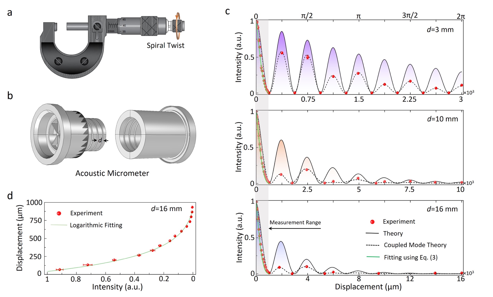 图2:声学螺旋测微器样机设计及实现。(a)日常使用的螺旋测微器;(b) 基于螺纹轨道原子的声学螺旋测微器;(c)不同螺距声学螺旋测微器(q=4)的干涉强度随着旋转位移的变化;(d)声学螺旋测微器(q=4,d=16 mm)定标函数曲线。