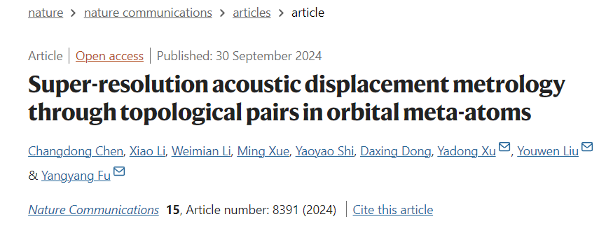 近日,PA视讯集团官网信息光子学团队在超分辨声学位移计量方面取得了突破性进展。团队通过构建共轭拓扑对的创新概念,揭示了模式空间马吕斯定律的物理机制,并基于螺旋测微原理提出了一种超高精度的位移计量新范式,并成功利用工作波长为100mm的低频声波实现了1.2μm的位移超分辨(λ/105)。相关成果以“Super-resolution acoustic displacement metrology through topological pairs in orbital meta-atoms”为题在线发表在国际顶级期刊《Nature Communications》上。伏洋洋教授、刘友文教授以及苏州大学的徐亚东教授为该工作的共同通讯作者,陈昌东副教授、博士生李潇为共同第一作者,薛明讲师、施瑶瑶副教授、董大兴副教授、已毕业硕士李卫冕对该工作亦做出了重要贡献。