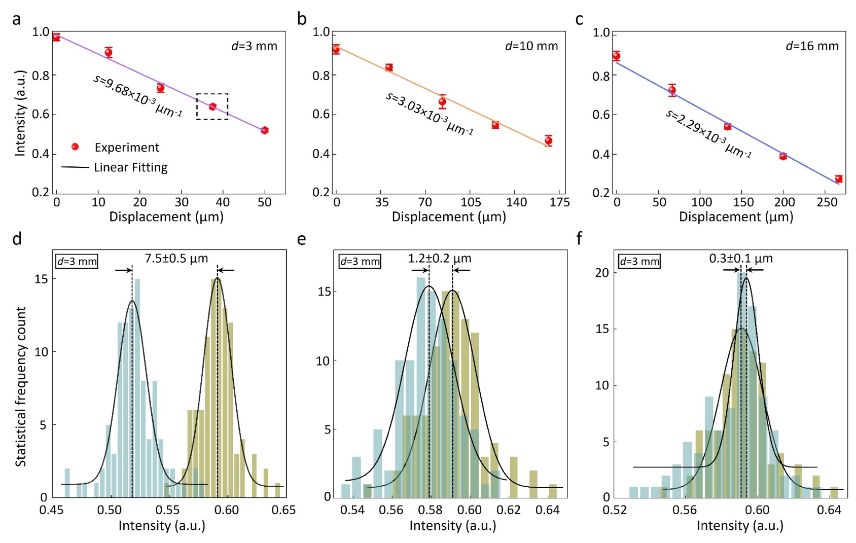 图3:声学螺旋测微器的分辨率和精度。不同螺距d=3 mm(a),d=10 mm(b),d=16 mm(c)声学螺旋测微器的最佳线性区;声学螺旋测微器(d=3 mm)的分辨率和精度:完全能分辨(d)、恰好能分辨(e)、不能分辨(f)。