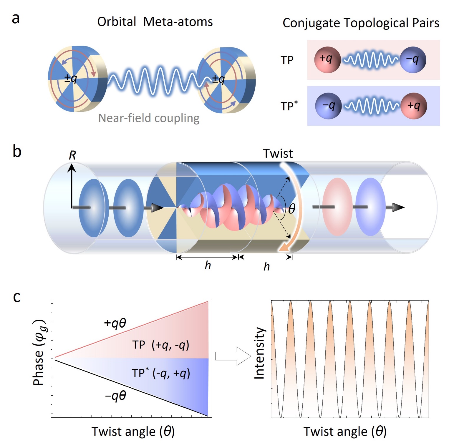 图1:共轭拓扑对的形成及其产生的声学马吕斯干涉效应。(a)轨道人工原子及其在模式空间形成共轭TPs示意图;(b)圆柱波导中入射平面波-OAM模式-出射平面波的实空间演化示意图。(c)共轭TPs的在模式空间累积相反的几何相位并产生干涉示意图。