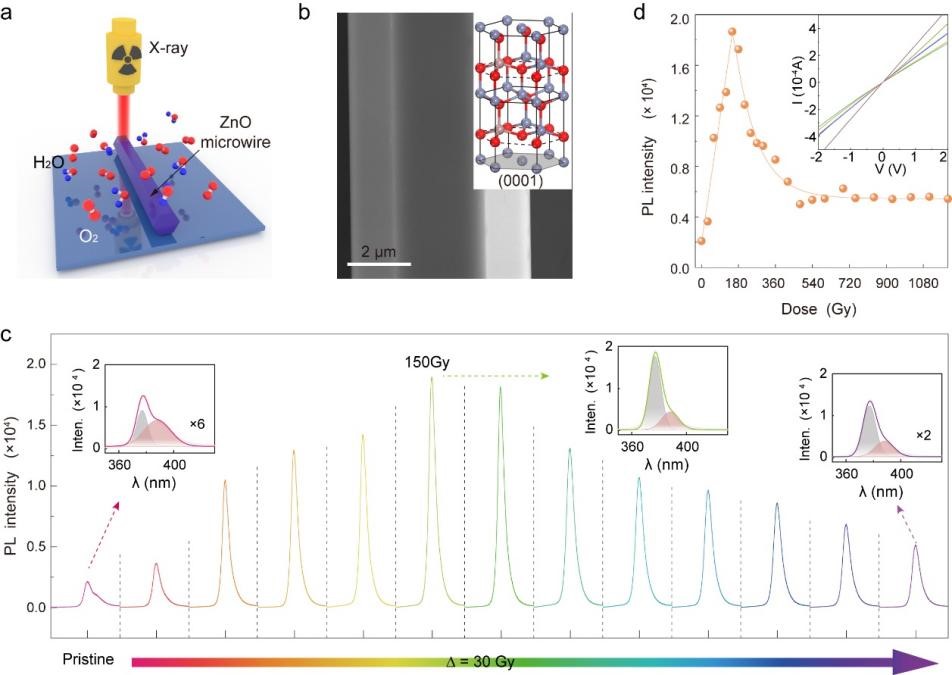 PA视讯集团官网光电功能材料器件与物理研究团队曹水艳副研究员与国际前沿科学研究院刘衍朋教授合作,研究了Ga掺杂ZnO微米线在X射线辐照环境下的光电特性,结果表明在150Gy的辐照剂量下,可以实现单根微米线9倍的光致发光增强,通过不同氛围下辐照的微米线的X射线光电子能谱(XPS)并结合DFT的理论计算,解释了光致发光的增强是由于材料表面氧空位的减少和晶格的弛豫。
